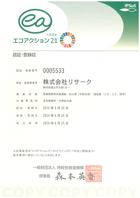 当社では未来を見つめる環境企業をめざし“エコアクション21”の認証を取得、先進の環境経営を積極的に実践しています。